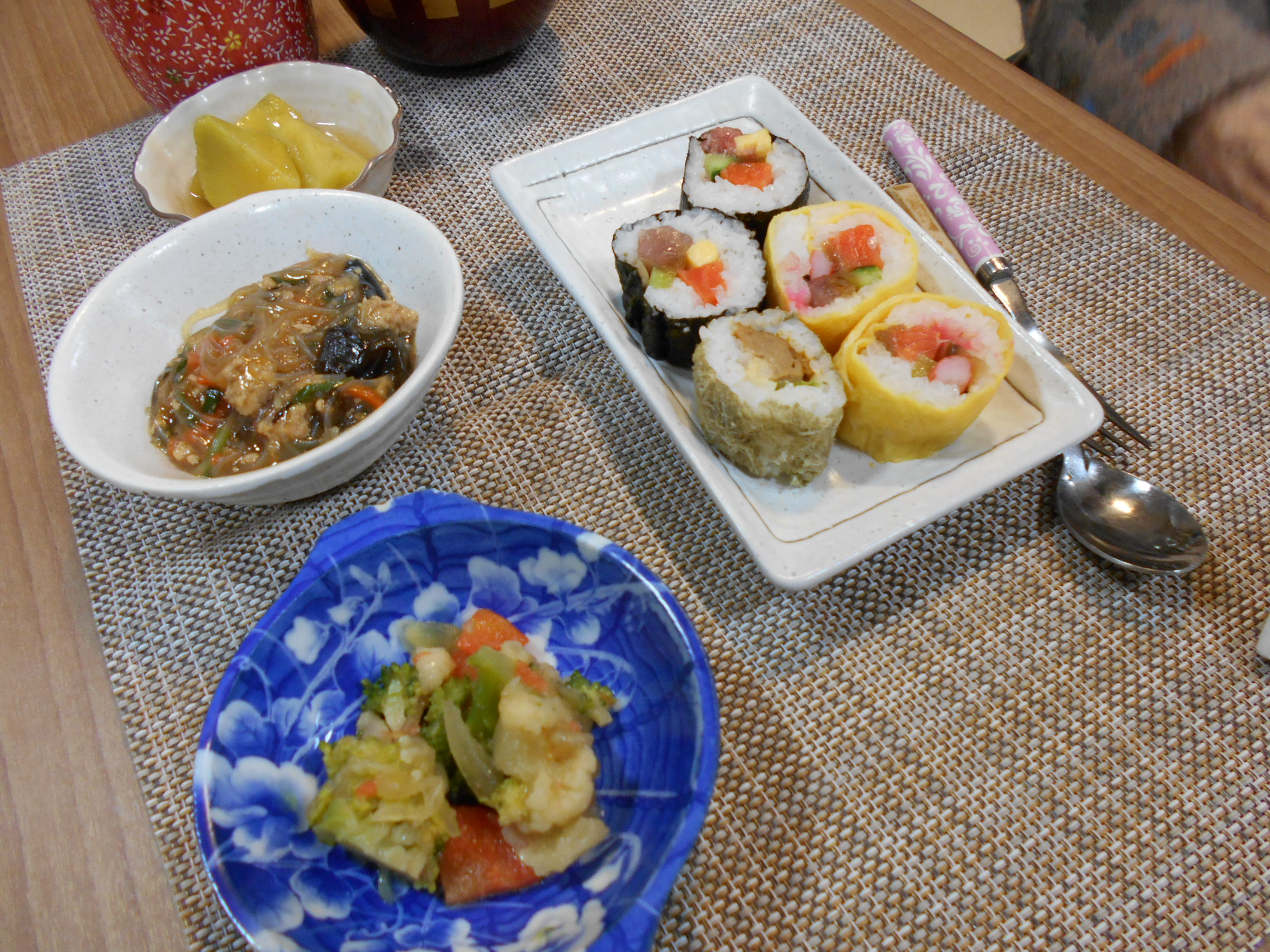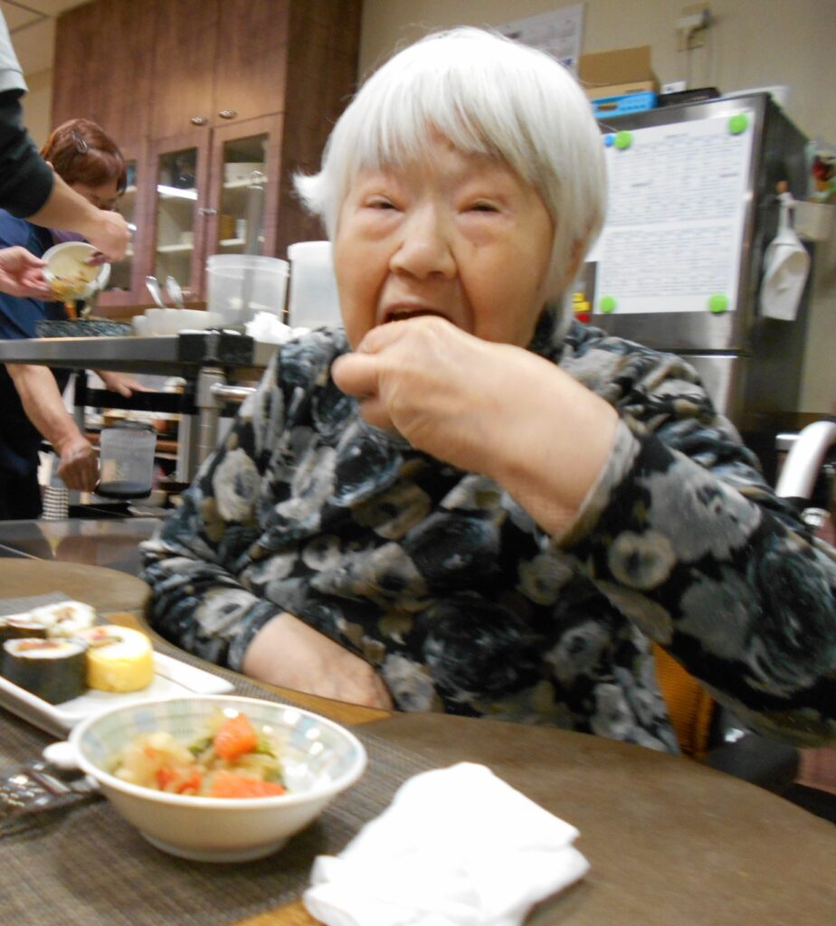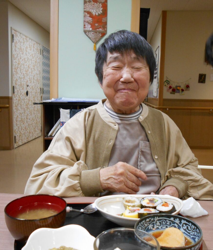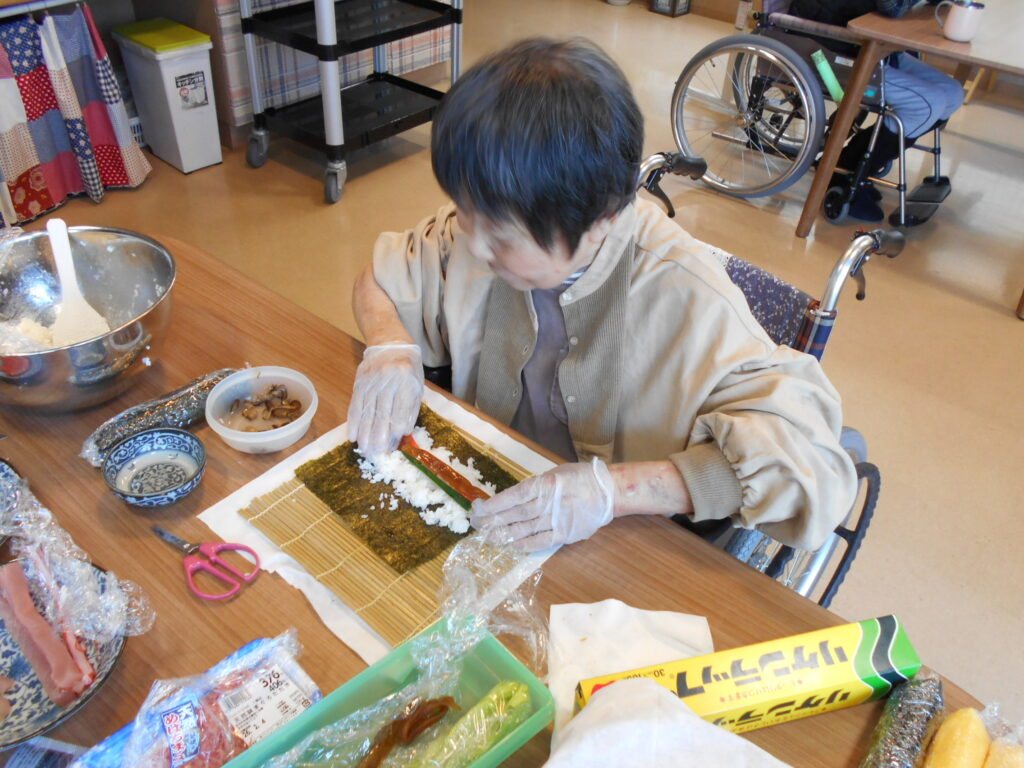 施設では各ユニットにて鬼に扮した職員に新聞紙を丸めたものを「鬼は外、福は内」と投げて豆まき(風)をしたり、恵方巻を作ったユニットもありました。