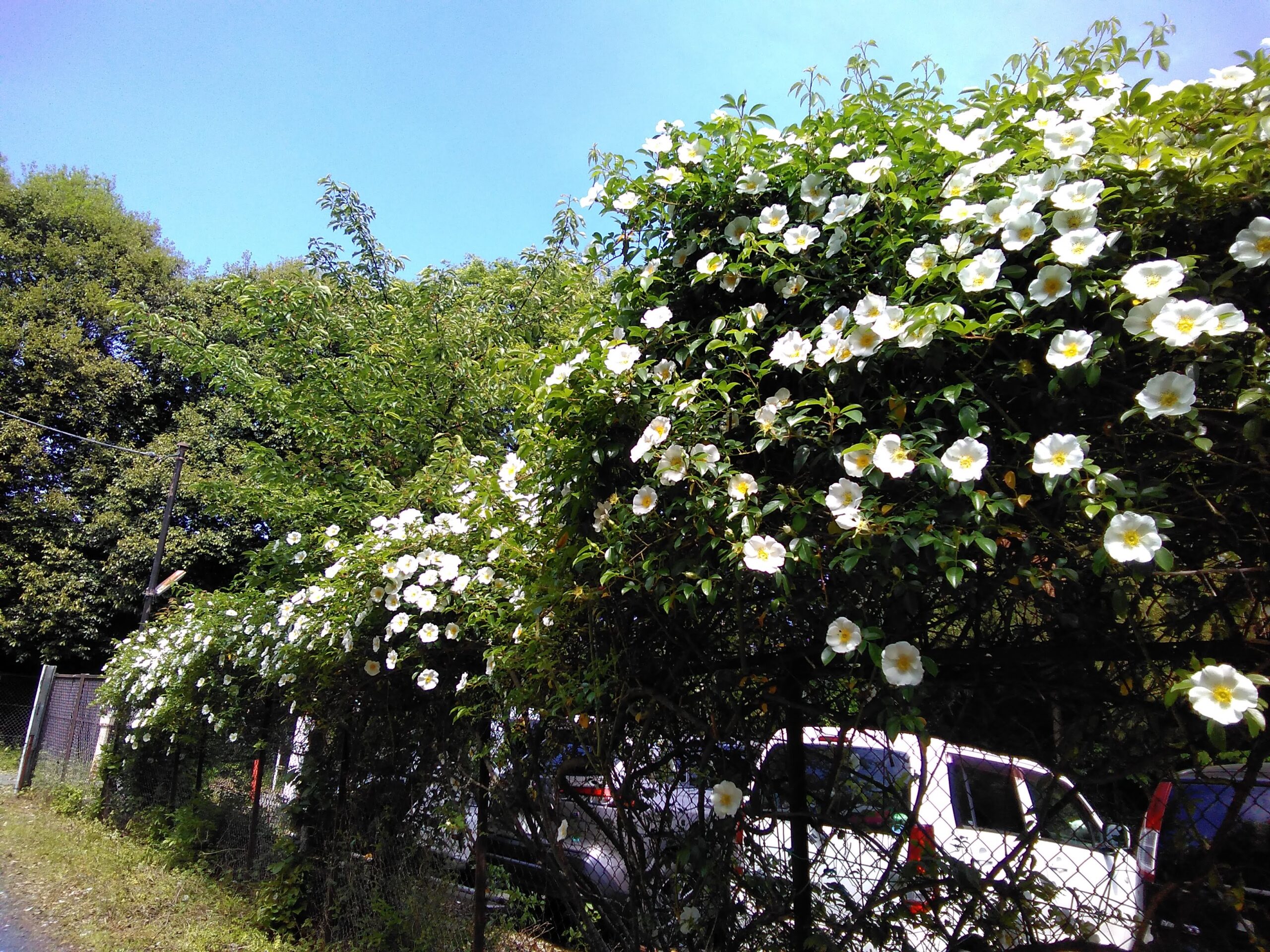 職員駐車場に咲き誇る白い花は野ばらです